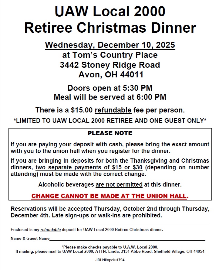 Retirees’ Christmas Dinner at Tom’s Country Place at 5:30 PMBy Linda Lynch / October 20, 2025 Click here for a printer-friendly version of the 2025 Retiree Christmas Dinner flyer.