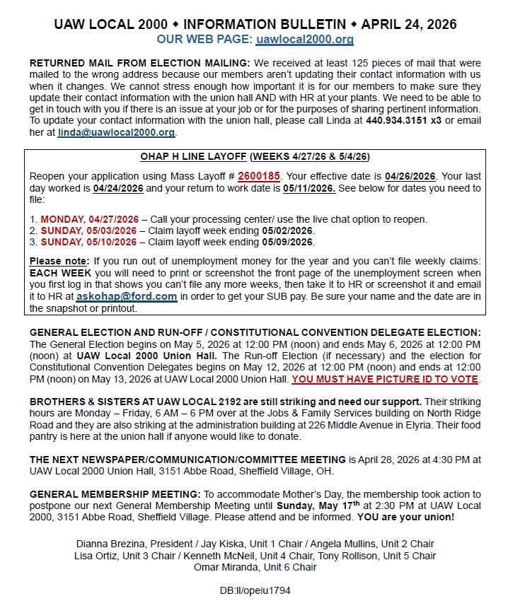 04-24-26 Bulletin – H Line Layoff (Weeks 4/27/26 & 5/4/26)By Linda Lynch / April 24, 2026 Click here for a printer-friendly version of the 4/24/26 bulletin.