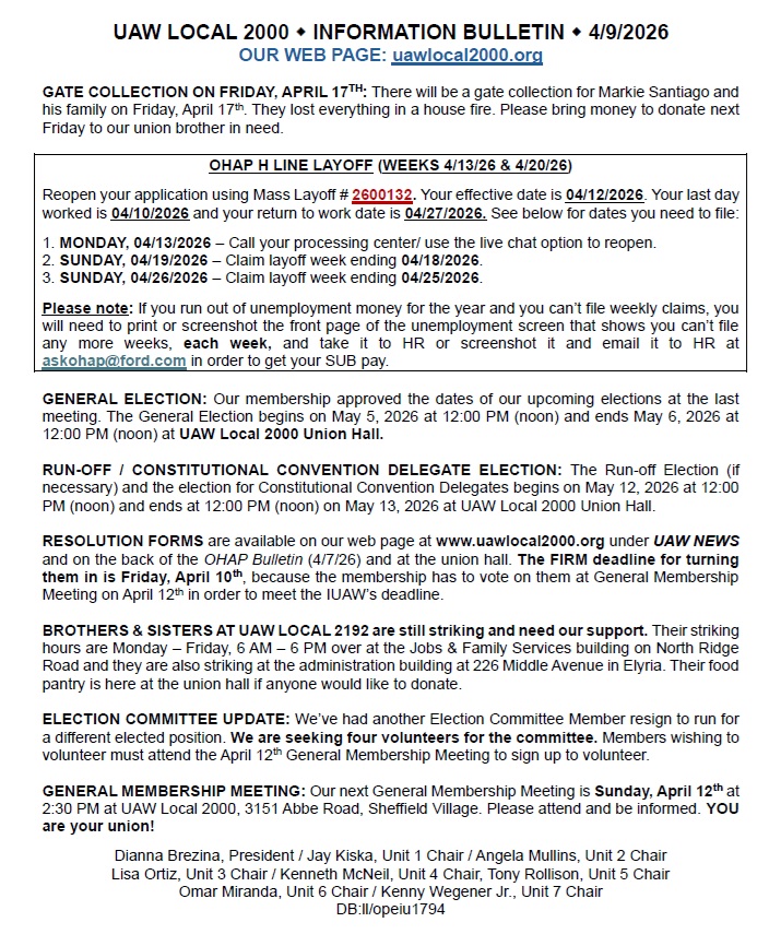 04-09-26 Bulletin – H Line Layoff (Weeks 4/13/26 & 4/20/26)By Linda Lynch / April 9, 2026 Click here for a printer-friendly view of the 4/9/26 bulletin.