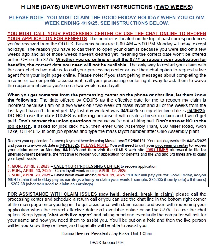 04-07-25 & 04-14-25 Bulletin H Line DaysBy Linda Lynch / April 10, 2025 Click here for a printer-friendly version of the 04/07/25 & 04/14/25 H Line Days layoff bulletin.
