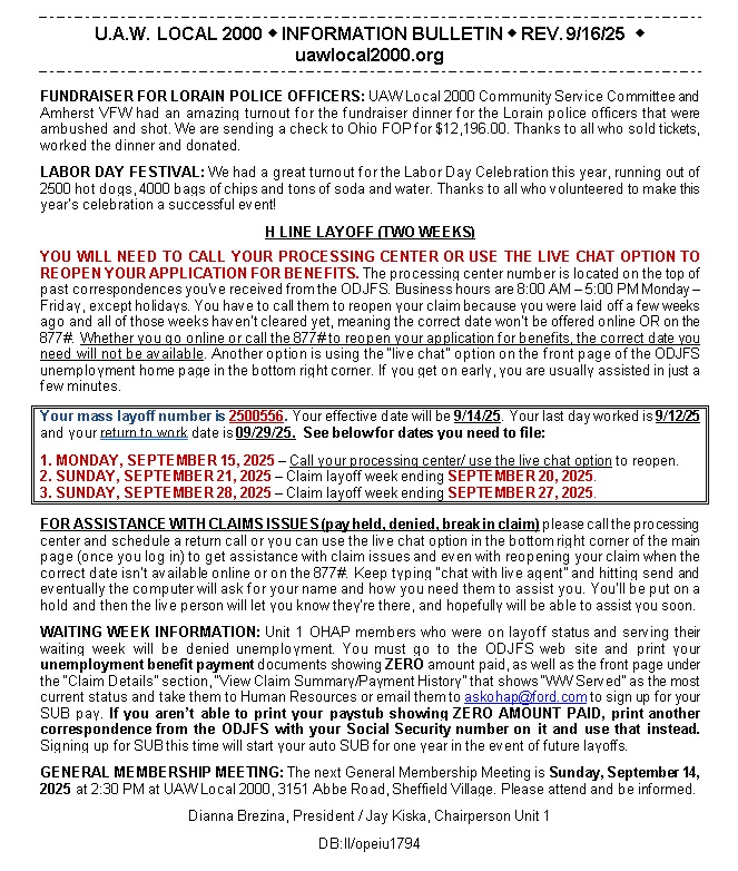 09-15-25 & 9-22-25 Bulletin H Line LayoffBy Linda Lynch / September 11, 2025 Click here for a printer-friendly version of the 09/15/25 & 09/22/25 H Line layoff bulletin.