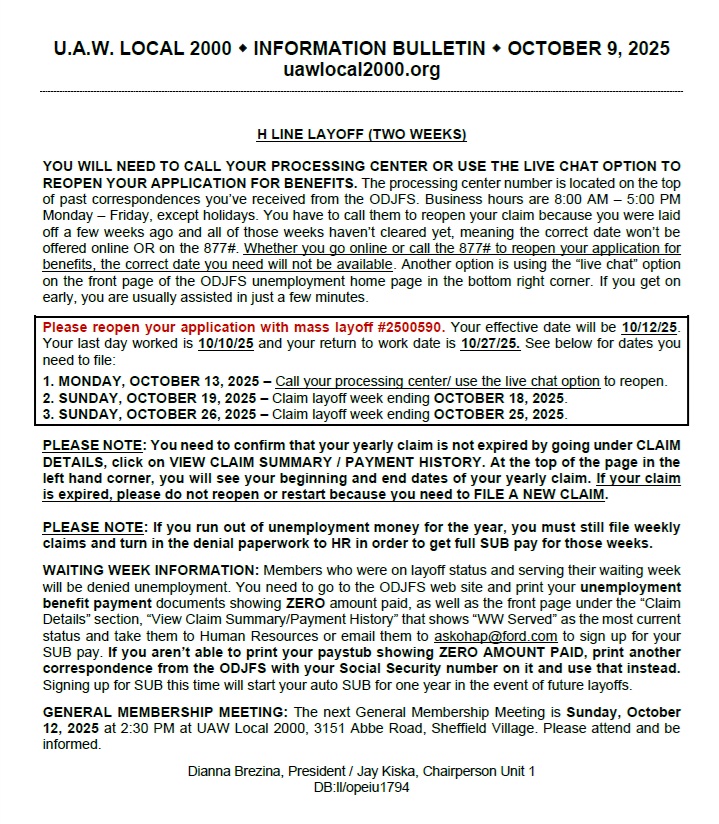 10-13-25 & 10-20-25 Bulletin H Line LayoffBy Linda Lynch / October 9, 2025 Click here for a printer-friendly version of the 10/13/25 & 10/20/25 H Line layoff bulletin (revised).