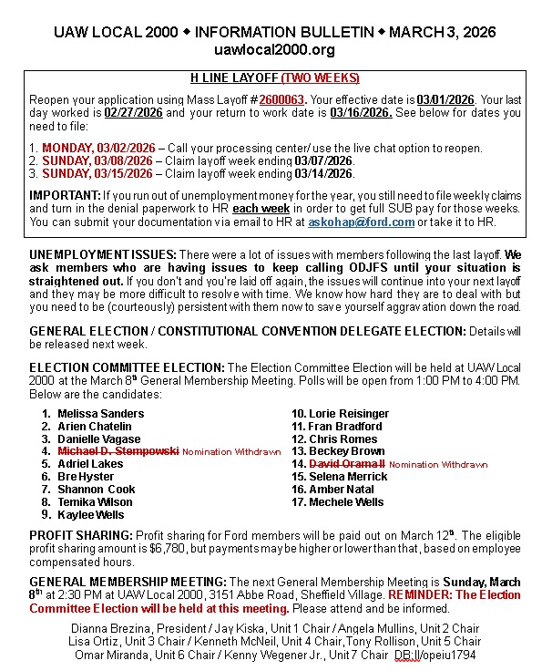 03-03-26 Bulletin – H Line Layoff (Weeks 3/2/26 & 3/9/26)By Linda Lynch / March 3, 2026 Click here to print the 3/3/26 bulletin.