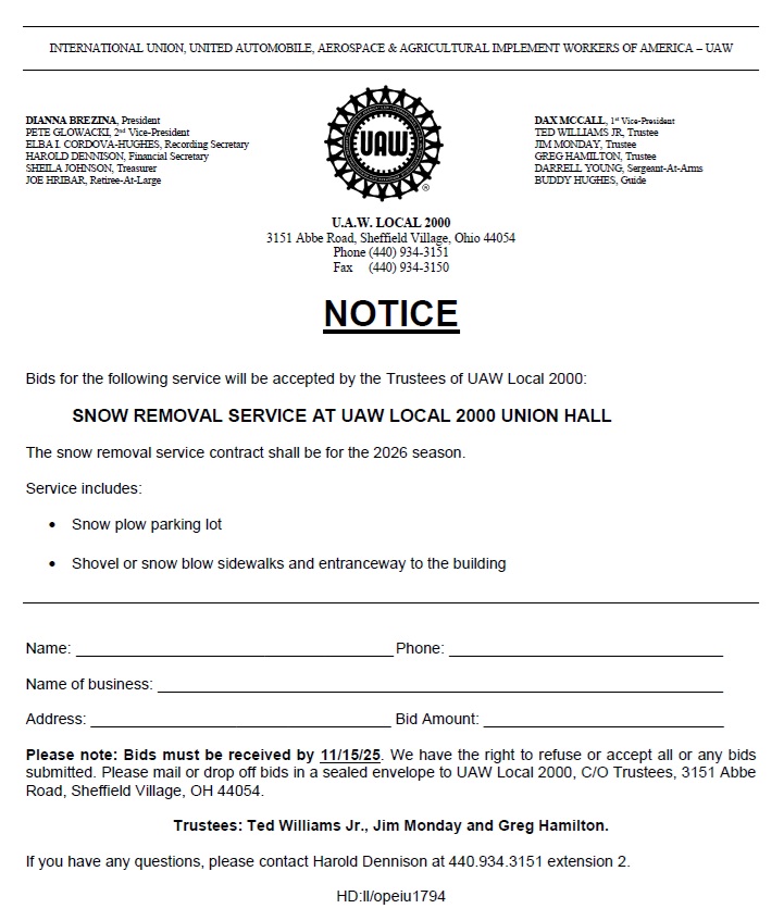Bid Announcement for Snow Removal Service at UAW Local 2000 (Deadline 11-15-25)By Linda Lynch / October 21, 2025 We are currently accepting bids for snow removal service at UAW Local 2000. Click here for a printer-friendly version.