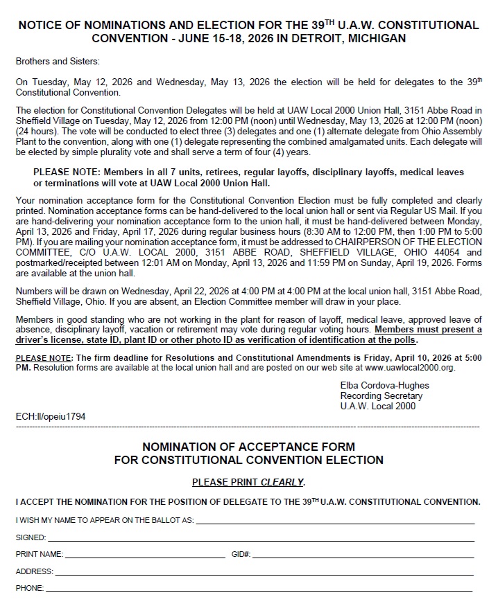 Official Notice of Election for Constitutional Convention Delegate with Nomination FormBy Linda Lynch / March 26, 2026 Click here to print the official notice of the Election for Constitutional Convention Delegates with the nomination form.