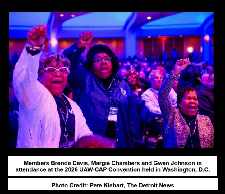 UAW-CAP Convention – Brenda Davis, Margie Chambers and Gwen Johnson 2-11-2026By Linda Lynch / February 12, 2026 Members Brenda Davis, Margie Chambers & Gwen Johnson, all fired up for the continuous fight for human, civil & workers’ rights.UAW-CAP Convention in Washington, DC.Picture credit: The Detroit News